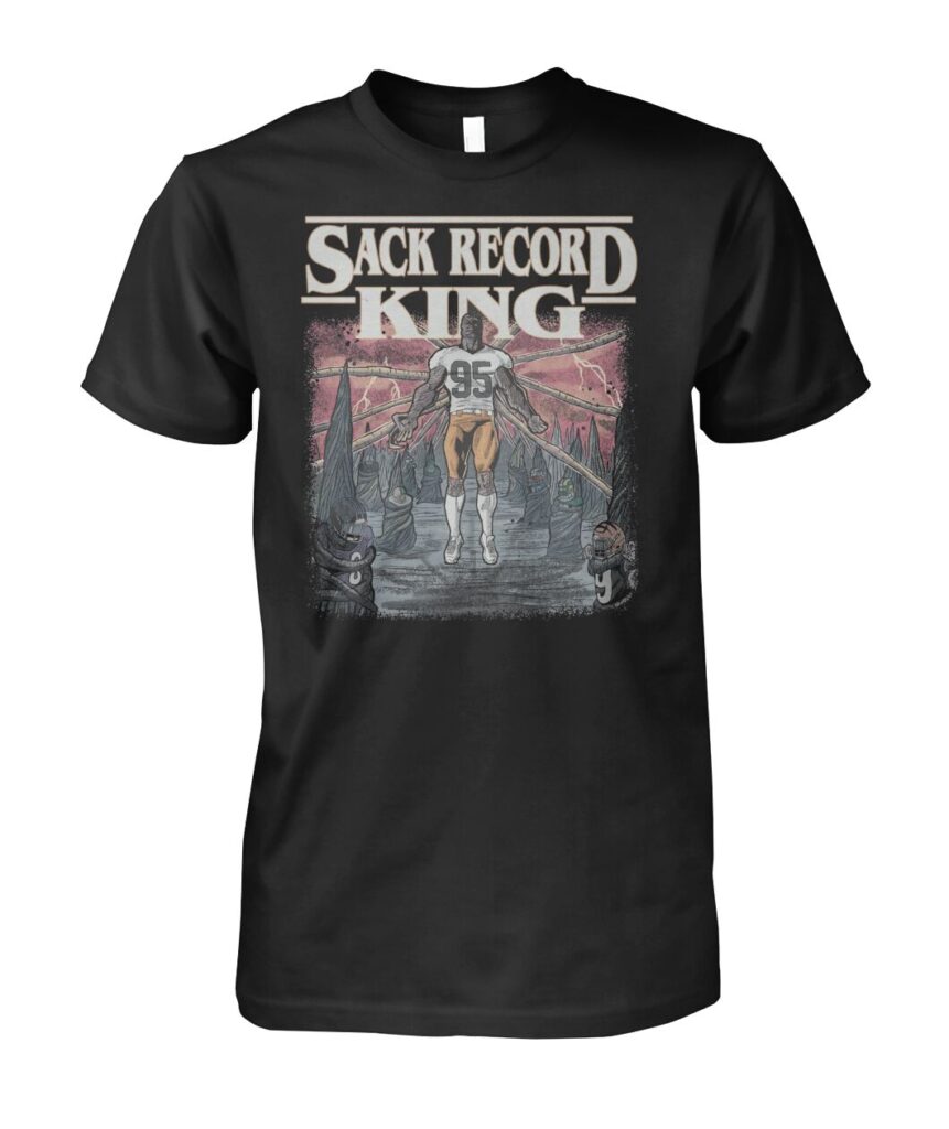 Show your support for football greatness with the “Myles Garrett Sack Record King Shirt”. This standout piece celebrates Myles Garrett’s incredible achievement as the sack record king, making it a must-have for true fans. Crafted from high-quality materials, the shirt offers unmatched comfort and durability, perfect for game days or everyday wear.The bold design of the “Official Myles Garrett Sack Record King Shirt” pays tribute to his record-breaking prowess on the field. Whether you’re cheering from the stands or watching from home, this shirt lets everyone know you back one of football’s most dominant defenders. Don’t miss your chance to own a piece of sports history—add the “Myles Garrett Sack Record King T Shirts” to your collection and wear it with pride!